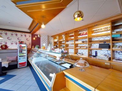 Das Gesamte Gebäude erstreckt sich durchwegs im Erdgeschoß und ist von zwei Seiten begehbar. Im vorderen Bereich befinden sich das Café und der Friseursalon mit Terrasse/Sitzmöglichkeiten. Im hinteren Teil befinden sich die Zufahrt zur Bäckerei/Konditorei und Parkplätze für Angestellte.